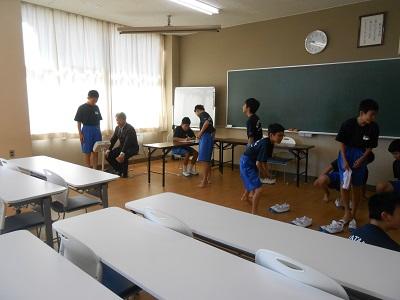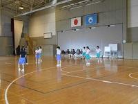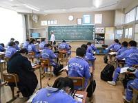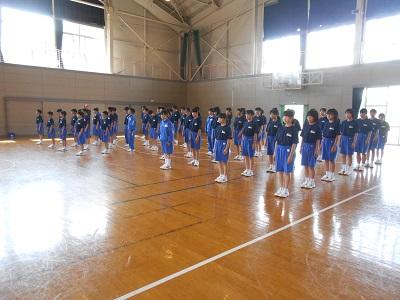 【授業の様子】 現在の気温が24℃を示しています。校内を歩いていると汗が出てくるほどです。5時間目、1年生が体育館で「保健体育」で集団行動を学んでいました。この集団行動は、安全を踏まえた行動の一つで、集合する際の整列の仕方や場所の広さによって列の増減を学ぶものです。この練習を通して、修学旅行や宿泊学習、避難訓練等で活かされます。