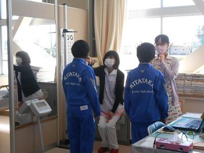 今日は眼科検診が行われ、学校医(眼科)に専門的に診察していただきました。特に中学生の時期は視力が低下することが予測されます。暗いところでの学習やゲーム時間の増加など、視力低下の原因をなくすように心がけましょう。
