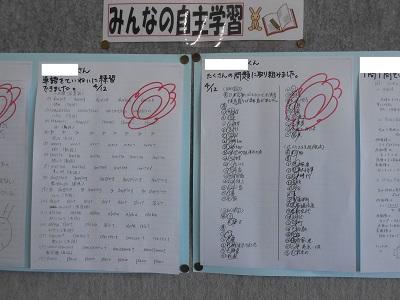 【校内散策】 教室を覗くと担任からのメッセージや家庭学習の様子が掲示されていました。