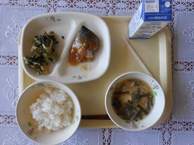 【給食メニュー】 さば味噌煮、かんぴょうのごま酢和え、にら卵汁です。