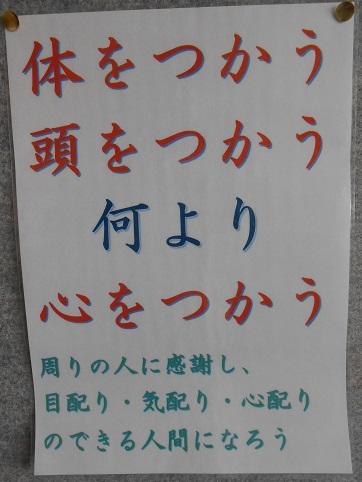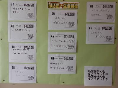 【校内散策】 廊下「部活動の生活目標」が掲示されていました。各部ともあいさつや行動等の目標を掲げ取り組んでいます。間もなく1年生が正式入部です。