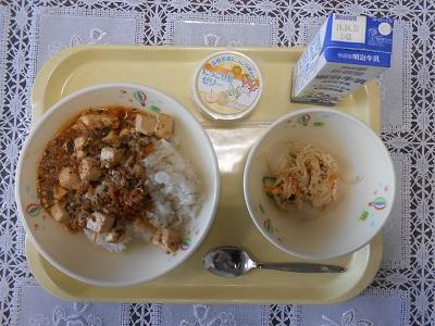 【給食メニュー】 マーボ丼、棒々鶏サラダ、高根沢産にっこりゼリーです。マーボ丼にはたくさんの具が入っていて味も最高でした。