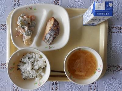【給食メニュー】 わかめご飯、みなみかごかますの生姜焼き、ポテトサラダ、大根と油揚げの味噌汁です。