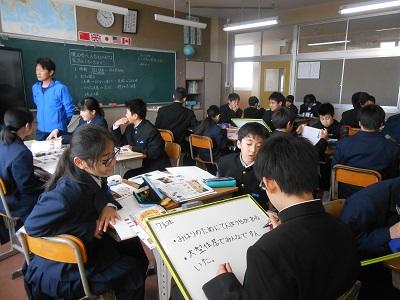 【授業の様子】 1年1組「社会科」歴史の学習です。グループでの「対話的」な活動の一つです。