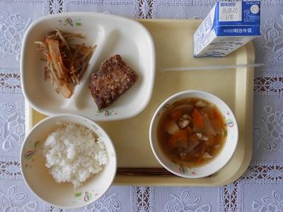 【給食メニュー】 もろのカレー滝田揚げ、ごぼうのきんぴら、のっぺい汁です。今日のメニューは「かみかみメニュー」です。よくかんで食べました。