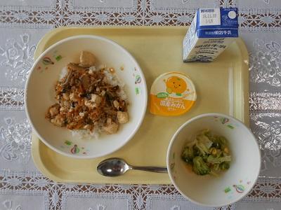 【給食メニュー】 辛さ控えめの麻婆丼です。