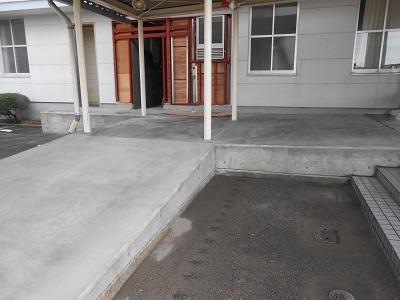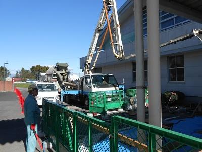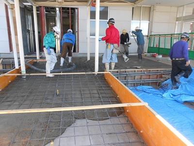 体育館のトイレ工事では、多目的トイレのスロープを作成中でした。コンクリートを流し込んでいました。