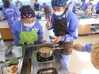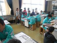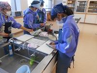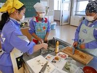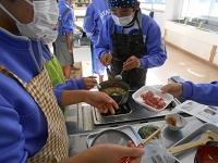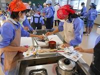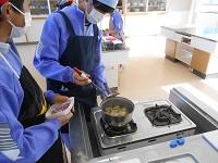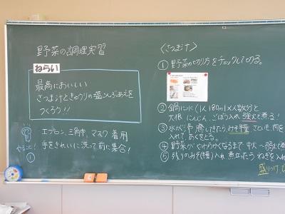 今日は1時間目から家庭科の授業で1年3組が「調理実習」を行っていました。ねらいは「最高に美味しい、さつま汁ときゅうりの塩こんぶ和えをつくろう」です。慣れない手つきで肉や野菜を切っていました。「家でもやるの?」と聞いてみたら「あんまり~」と言っていました。今日の献立を家でつくって、保護者に食べてもらうことを宿題にしたいですね。