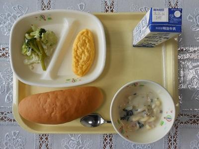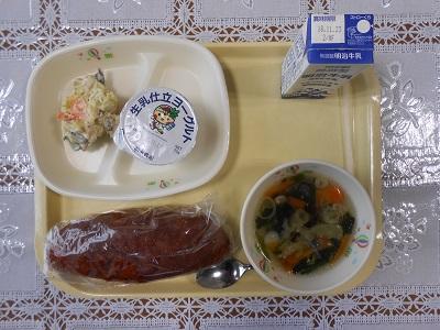 【給食メニュー】 揚げパンとさつまいものサラダ、白菜ときくらげのスープです。