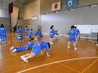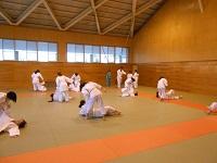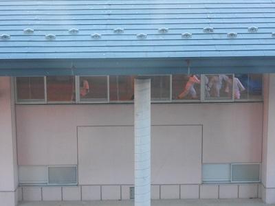 調理室から武道館を眺めると2年女子が柔道の授業が見えました。