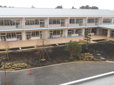 東小学校の庭園が完成した様子です。芝生も張り、来年の春になるのが楽しみです。