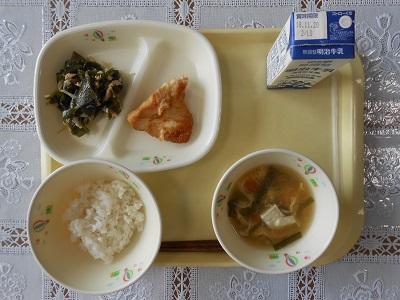 【給食メニュー】 にら卵汁と鶏の唐揚げ、わかめとツナ和えです。