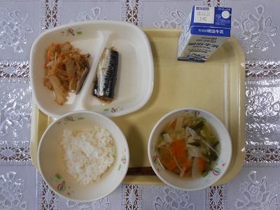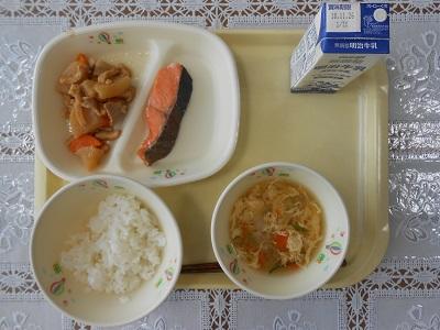 【給食メニュー】 ゆばとほうれん草のスープ、いわし、切り干し大根です。