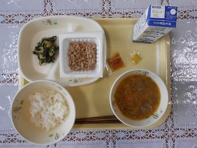 【給食メニュー】 納豆と豆腐仕立ての野菜汁、かんぴょうの和え物です。