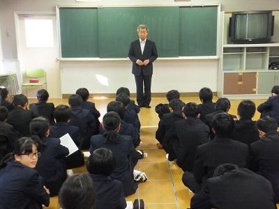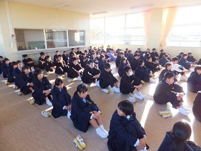 1年生は学校生活を振り返り、成果が表れている活動や改善が必要な活動について、学年主任や担任からお話を聞いていました。