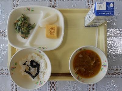 【給食メニュー】 豚汁に春菊のツナ和え、のりの佃煮、にっこり梨、とちまる印の卵焼き