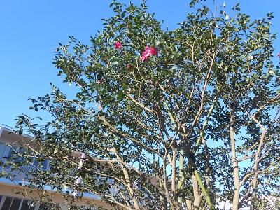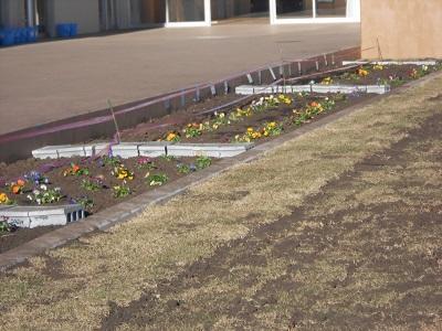 午後、校舎周辺を散歩していると、小学校の中庭に植えた椿に花が咲いていました。暖かい日が続いたので咲いたのでしょうか。また、花壇には東小の児童が植えた花(パンジー)が色とりどりに咲いています。中庭を見るのが楽しみです。