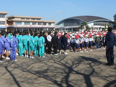 2時間目の休み時間を活用し、東小学校との「合同避難訓練」を実施しました。理科室からの火災を想定し、それぞれの教室から避難場所(校庭南側)へ集まる練習です。小学生も体育館で授業があり、それぞれが静かに避難していました。小学生と中学生が全員同じ事を行うのが初めてで、お互い緊張していた様子です。これからも合同で行う行事を検討していきます。