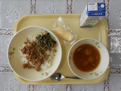 【給食メニュー】 豚そぼろ丼になめこ汁、果物のリンゴです。おひたしもさっぱりして美味しかったです。