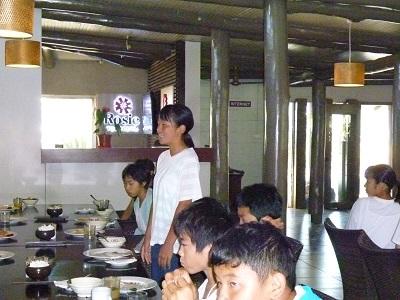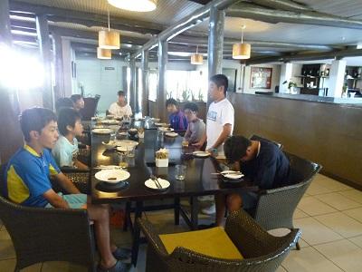 7:00(日本時間3:00)朝食です。朝は肌寒く感じます。集合時間に数名遅れましたが、全員元気で、朝食をいただきました。今日は、コロトコ村にてマングローブの植林体験があります。天気も最高です。