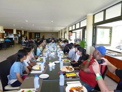 朝食、6時50集合に今日も数人遅れてきましたが、全員元気なあいさつで朝食をいただきました。食事はほとんどがバイキング形式です。肉ばかり食べる子や野菜を多くたべる子、食事時間も様々です。自分の健康管理に気を付けながら食べています。帰国後に「太った」と言う生徒が多いような気がします。