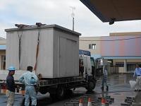 さて、今日は朝から大型重機が校舎前を動いています。今まで災害時の避難所は東小学校体育館でしたが、今回の移転で本校体育館が避難所に指定されました。よって、体育館南側に「防災倉庫」が設置されました。また、本校の「ゴミステーション」も校舎北側に設置いたしました。