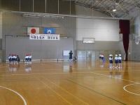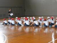 体育館では東小の1・2年生が体育の授業を行っていました。紅白帽子を着用し、先生の話を真剣に聞いていました。