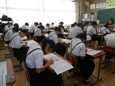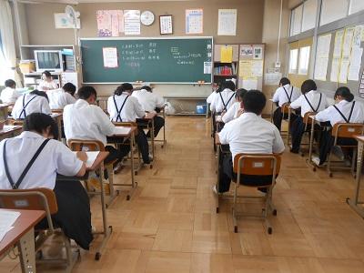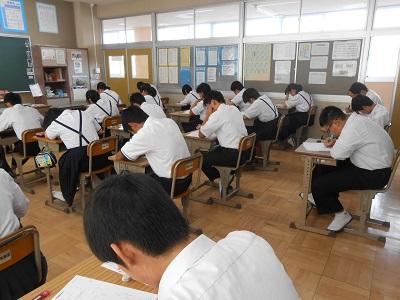 今日から期末テストです。本校では中学校で学ぶ9教科(国語・社会・数学・理科・英語・音楽・技術家庭・保健体育・美術)を2日間で行います。授業中の発言や態度、課題の提出状況、級友との協力、復習テストの状況、定期テストの状況等を総合的に判断し、1学期の評価を行います。そして、その評価から評定(通信票)を導きます。生徒の皆さんには、自分の将来を見つめ、今、何をするべきかをしっかり考えて授業に臨んでほしいです。