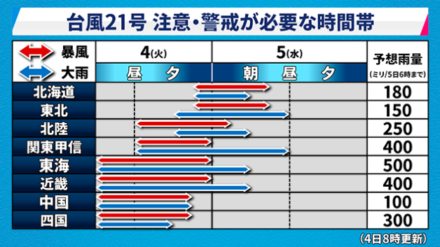 現在(9/3 14:00)、非常に強い台風21号は、4日の日中には勢力を維持したまま四国地方から紀伊半島に接近・上陸する見通しです。そして、明日の予報では15:00ぐらいから雨・風が強いとのことです。