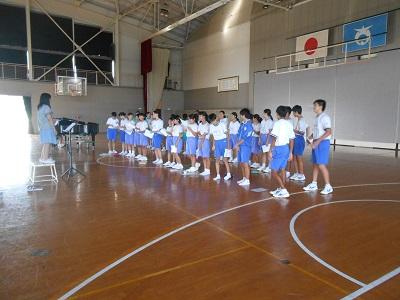校長の話では、地区総体での真剣で最後まであきらめない取り組みに賞賛と感謝をするとともに、3年生には今後新たな目標に向かって、部活動で鍛えた「精神力」と「体力」を生かしてほしいとお願いしました。また、1・2年生には地区新人大会に向けて、3年生から学んだことをさらに精進してほしいと伝えました。さらに、これからの生活について、急激な天候の状況に応じた対応と東小の児童との交流・連携をお話しさせていただきました。最後に、3年生に転校生(男子生徒)が来たことを紹介しました。