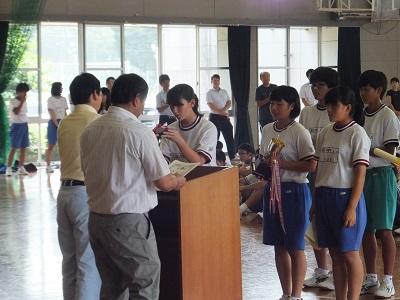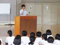 はじめに「表彰」、続いて「校内清掃コンクール表彰」・「校長講話」「生徒主事からの話」「学習指導主任からの話」がありました。校長講話では、この夏(38日間)でしか出来ないことを、それぞれの学年に応じて取り組んでほしい。そして、安全で健康的な生活を送ってほしいとお願いしました。最後に8月28日(火)に登校する際は隣接する「東小学校」の児童が新校舎で学習・生活するので兄や姉の立場で見守ってほしいと伝えました。