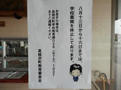 さて、本来であれば、平日は教職員が対応していますが今日から16日(木)まで「学校休業日」として、誰も勤務しておりません。緊急の場合は教育委員会へ御連絡願います。