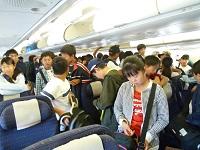 団員全員元気です。現在、空港内で軽食中です。予定通り、21:25発に向けて、準備中です。
