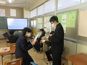 核兵器禁止条約を日本は批准すべきかどうかをみんなで考えていました。いろいろな意見が出されて、興味深い授業でした。生徒たちはよく考えていました。
