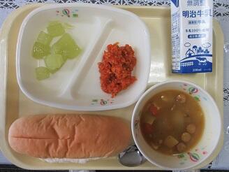 今日の給食は、米粉パン、牛乳、トマトオムレツ、ブロッコリーとチーズのサラダ、ABCマカロニスープ、ヨーグルトです。高根沢町で生産された物、にんじん、米粉パンです。今日もたいへんおいしく頂きました。