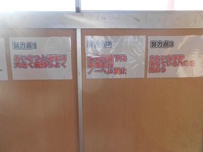 さわやかな朝を迎えました。本日は新体力テスト・避難訓練があります。昇降口に入ると、過日行われた「生徒総会」のスローガン及び努力点が掲示されていました。生徒自ら考え、決めたことをしっかり守れるよう支援していきたいと思います。