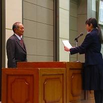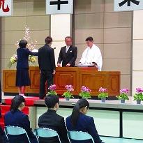 ●同窓会長の齋藤満則様にご来校をいただき、「ごあいさつ」と「記念品」を代表生徒(山本君)に授与していただきました。