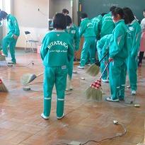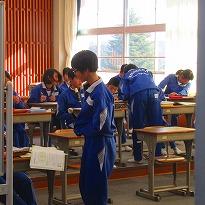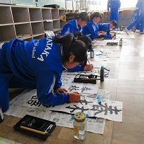 (書写の授業 床に広げて書く生徒が多いようです)