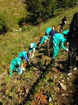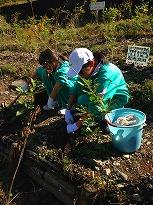 10時30分には足尾に到着し、「足尾の緑を守る会」の方と植樹の山に登り、1人1本の「植樹」を行いました。