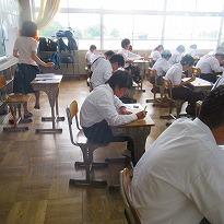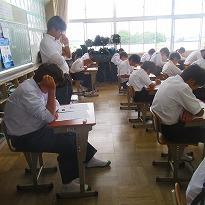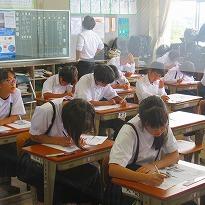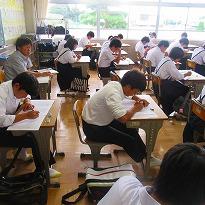 ●今日は、「漢字」の時間で、各クラスとも50題の漢字プリントが配られ、生徒は15分間、真剣に正答の漢字を書き込んでいました。