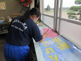 放課後美術部の活動を見に行くと、以前お知らせした国体の応援のぼり旗の彩色している3年生女子がいました。聞くと終わらなかったところを先生に許可を取って自主的にやっているとのことでした。素晴らし5名の3年生女子です。