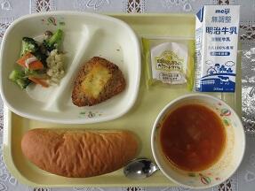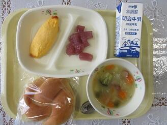 今日の給食は、米粉パン、牛乳、チーズオムレツ、野菜とウインナーのスープ、カットゼリー(ぶどう)です。高根沢町で生産された物は、玉ねぎ、米粉パンです。今日もたいへんおいしく頂きました。