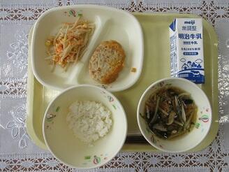 今日の給食は、ご飯、牛乳、野菜コロッケ、変わりきんぴら、大根と油揚げの味噌汁です。高根沢町で生産されたものは、味噌、ねぎ、米です。今日もたいへんおいしく頂きました。