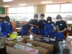 図書室をのぞいてみると、3名の1年生図書委員が、本の帯を取り外し、余分なところを切り取る作業をやっていました。委員会の仕事をしっかりやっている1年生でした。
