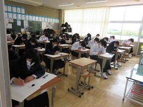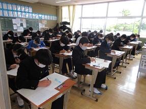 今日の3年生は1校時から実力テストに挑戦しています。じゃまにならないように廊下から少しだけのぞいてきましたが、どちらのクラスとも集中して取り組んでいました。
