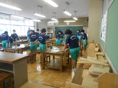 1年3組「技術」木材加工の作品の設計図を仕上げていました。
