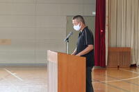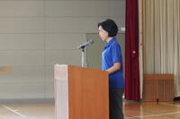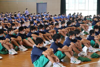 【夏休み前集会】授業終了後、体育館で集会を行いました。4か月を振り返るとともに、夏休み中に意識して生活することを伝えました。