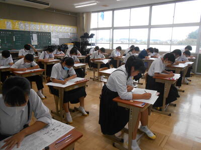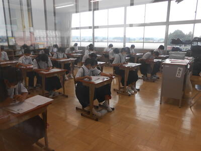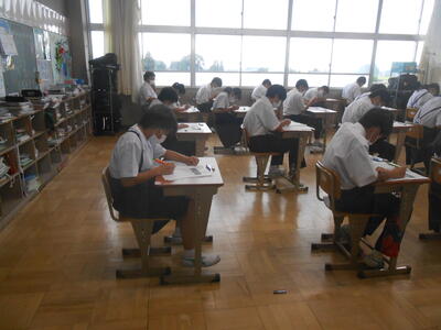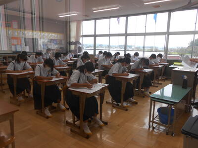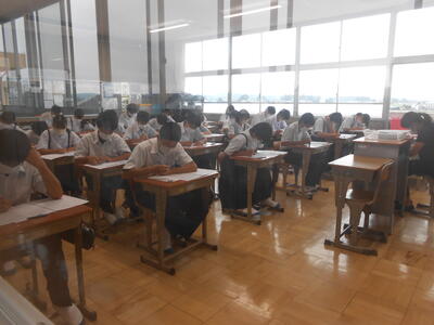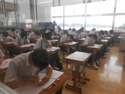 【テストの様子】テスト最終日、残り2教科です。今日は静かに教室内に入り、生徒の回答状況を確認しました。空欄(無回答)が無いようにしっかり文字を書いていたのが印象的でした。わからなかった問題や間違った問題は早めに解決しましょう。