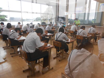 【テストの様子】廊下を歩いていても声が全く聞こえない静かな状況で問題に取り組んでいました。窓越しから撮影しても誰一人として問題から目を離す生徒はいませんでした。素晴らしい集中力です。(窓越しでの撮影のため鮮明ではありません m(_ _)m)