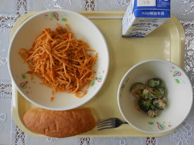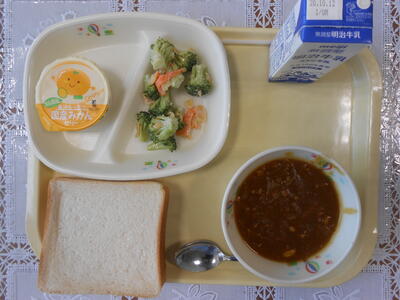 【給食メニュー】ポークカレー、牛乳、ごぼうサラダ、みかんです。カレーは生徒の好物の一つで、甘味がありとても美味しかったです。ごちそうさまでした。